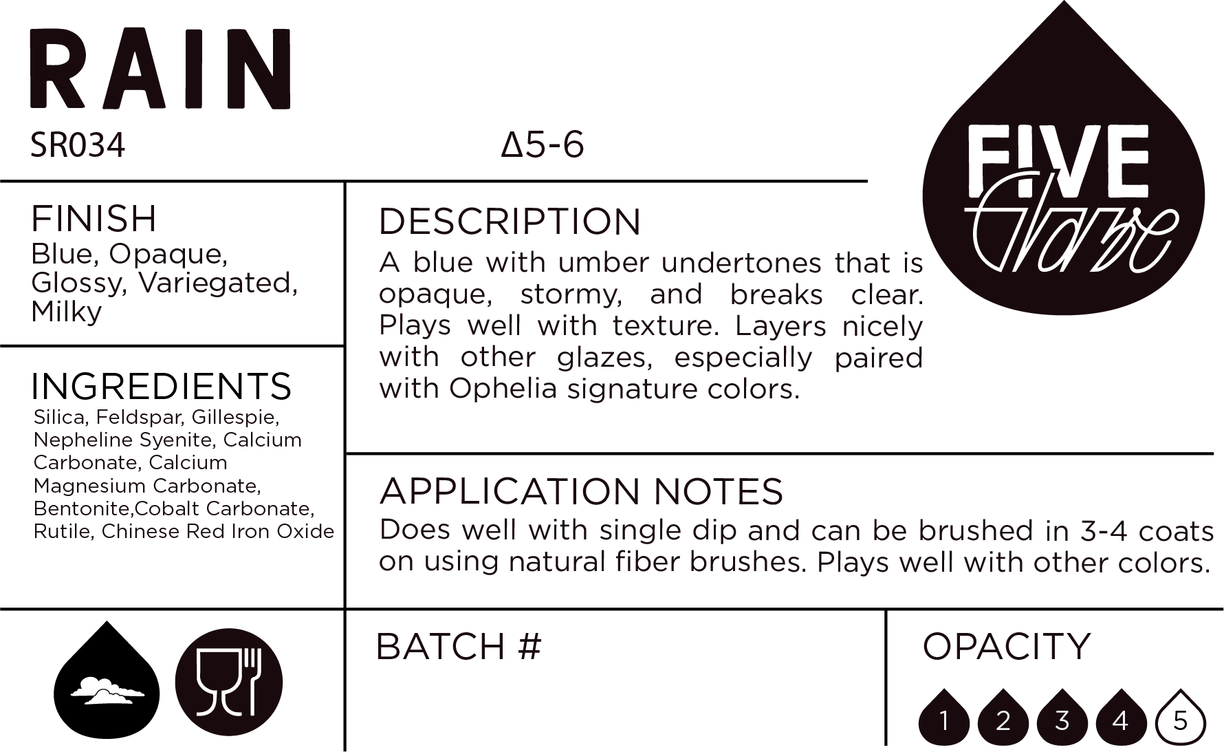 Are Five Glaze products food safe when fired? Food safety is a tricky subject in ceramics, all our glazes are non-toxic when properly fired and can be safely used with no concern for leaching. We rigorously test each glaze combination and recommend Serotonin for dinnerware use.